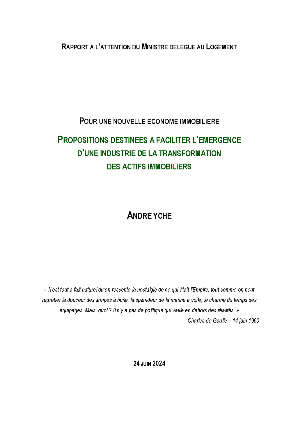 Yché, André. (2024). Pour une nouvelle économie immobilière : Propositions destinées à faciliter l’émergence d’une industrie de la transformation des actifs immobiliers . [Rapport au Ministre Délégué au Logement].